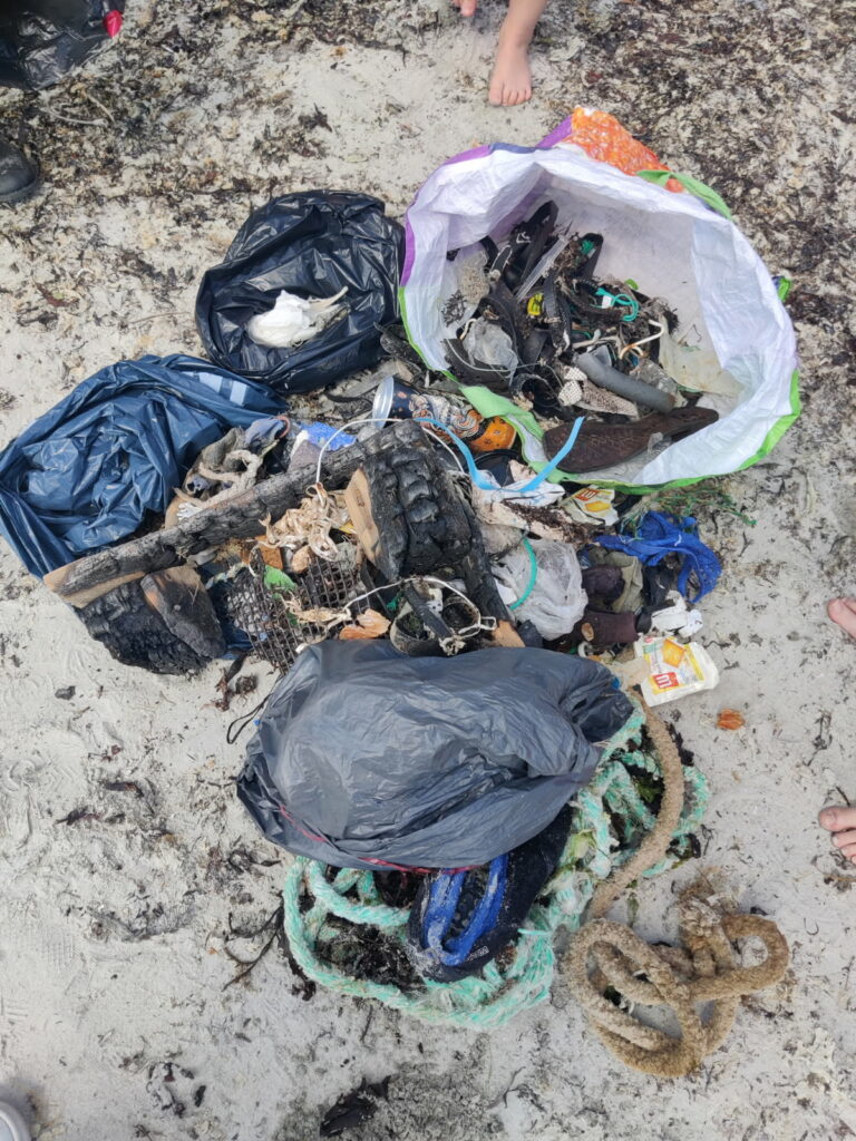 Pas beaucoup de bouteilles en plastique mais beaucoup de déchets lié à la pêche, morceaux de cordage, de filets. Un bidon plastique, une bouteille de gaz sur laquelle poussait des pousses pieds.